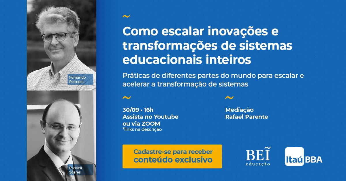 Itau BBA e BEI Educação promovem nesta quarta-feira (30), às 16 horas, debate online “Como escalar inovações e transformações de sistemas educacionais inteiros”, com as...