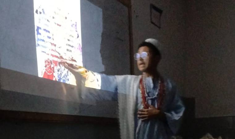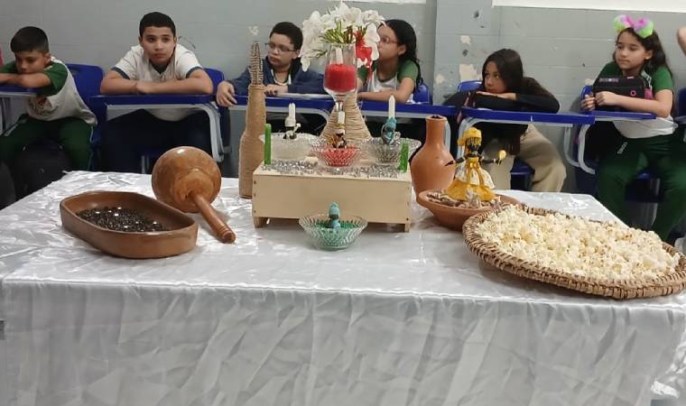 Outro momento marcante ocorreu quando um estudante praticante de Candomblé conduziu uma aula sobre religiões afro-brasileiras, apresentando roupas e objetos sagrados para discorrer sobre hierarquias e rituais.