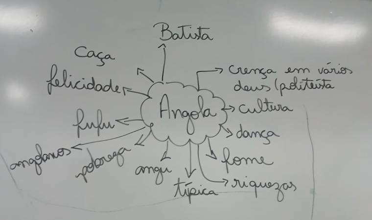 A cada semana, a turma “viajava” para um país africano, explorando sua história, geografia, espiritualidade, arte e influência na cultura brasileira. Começamos por Angola, debatendo como a colonização portuguesa proibiu línguas locais e impôs o português, que hoje falamos não por escolha, mas como herança de dominação.