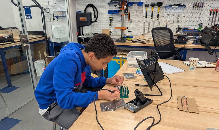O campus da Franklin é ancorado por seu Fab Lab, um espaço que integra design com matemática, inglês e ciências, onde os estudantes lideram projetos reais de longo prazo. Nesse ambiente, eles aprendem a programar, fabricar protótipos, projetar robôs e treinar modelos de inteligência artificial.
